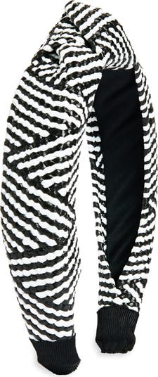 Add an eye-catching touch to your tresses with this center-knot headband wrapped in striped straw.