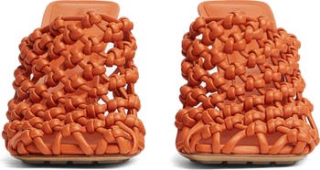 This runway-featured sandal from the spring/summer '25 collection embodies the brand's love in texture with its knotted weaving. The collection's child-inspired whimsy bounds through in the shape of a tree frog heel charm.