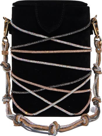Crystal braids wrapped on velvet cylindrical bucket bag | button closure | braided crystal strap as handle