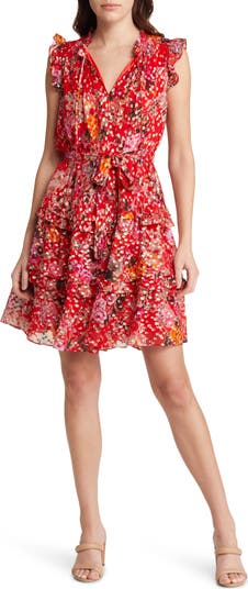Delightful blooms sweeten this tie-waist tiered dress designed with soft ruffles and striking metallic dots.