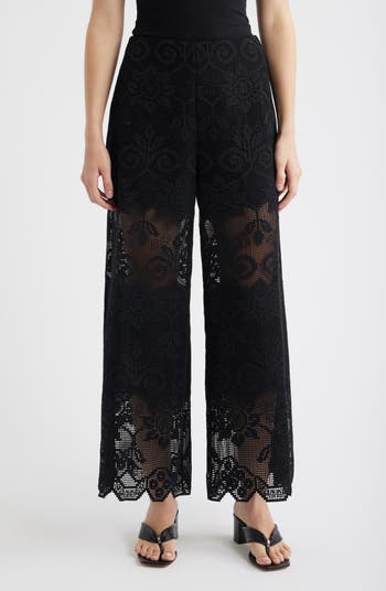 Wide scallop-edged legs bring a trendy flourish to ankle-grazing pants fashioned from delicate lace for breezy sophistication.