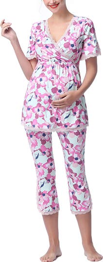A ultra soft pajama top is designed to adapt to your changing body from pregnancy to motherhood with a flattering surplice neckline, empire waist, and pretty lace trim. Comfy capri length over belly pant is designed especially for C-section recovery.
