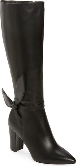 Heighten the edge of your next going-out look in this sleek knee-high boot crafted from smooth leather and accented by a statement bow detail .