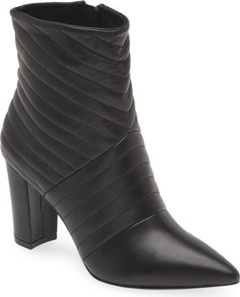 Diagonally quilted leather lends polished appeal to this pointy-toe bootie set on a slightly rounded block heel.