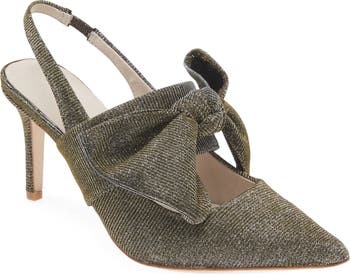 A floppy bow graces the glittering upper of this pointy-toe pump framed by a delicate slingback strap and stiletto heel.