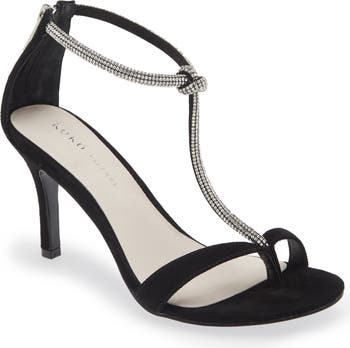 Glittering pavé rhinestones trace the T-strap of a soft suede evening sandal lifted by an elegant heel and finished with a back-zip closure.