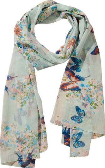Made with lightweight crinkle chiffon, this breezy and beautiful scarf features a delightful butterfly pattern on a blue background. The blue and peach flowers and vibrant orange and blue butterflies will add a pop of color to any outfit. Made with 100% polyester for comfort and durability. A Ten Thousand Villages Exclusive handcrafted in India.