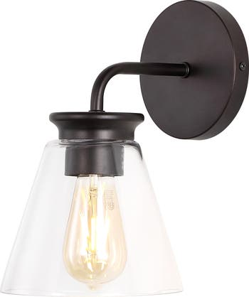 The clean lines of this single vanity wall light give it a pared-down minimalist look. A soft bronze finish and flared, clear glass shades add low-key vintage style over a bathroom mirror. A warm Edison-style LED bulb provides soft, diffused light for the bathroom or kitchen.