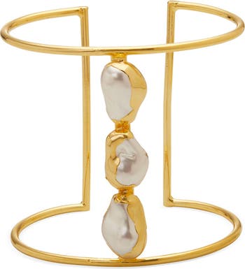 The Kora Bracelet is handcrafted in 22k gold-plated brass and adorned with luminous baroque shell pearls dipped in gold. Its bold yet refined design draws inspiration from the transformative beauty of the moon, creating a statement piece that complements both daytime and evening looks.