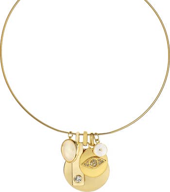 A collection of charms is deisgned with minimalist elegance to elevate the lightweight wire frame of this golden necklace.