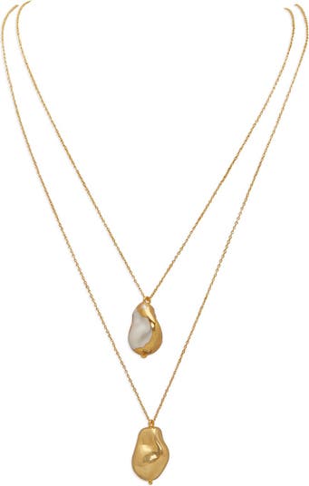 The Kora Pendants are handcrafted in 22k gold-plated brass, featuring two delicate baroque shell pearls suspended on adjustable chains. Designed for versatility, the pendants can be worn together or individually, capturing fluid movement and balance in every wear.