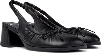 A delicate bow and gathered topline bring distinct elements and dimension to a slingback pump shaped from rich leather and set on a wrapped block heel.