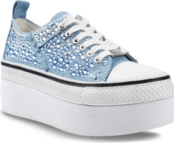 A jewel-encrusted upper lends striking everyday glamour to a lace-up sneaker lifted by a sky-high platform.