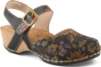 Breathable perforations highlight the hand-painted leather upper of a well-cushioned clog lifted by a faux-cork demi wedge for walkable height. A padded collar and adjustable ankle strap offer a comfortable and secure fit.