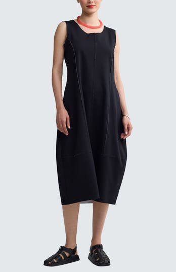 Architectural sleeveless midi dress in black cotton. Features a voluminous barrel silhouette, hidden pockets, and striking exposed white contrast stitching.