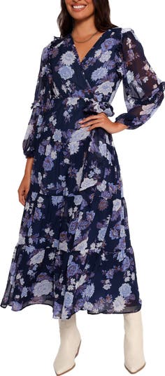 Semisheer sleeves frilled with ruffles underscore the ethereal charm of this blossom-tossed dress designed in a flowy wrap silhouette.