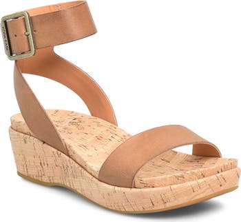 A cork-wrapped platform and integrated wedge heel elevate a minimalist leather sandal fitted with an adjustable ankle strap for a secure fit.