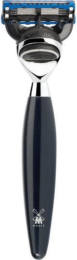 5-blade razor, compatible with Gillette Fusion Handles made of high-grade resin with chrome-plated metal highlights The Material - High-grade resin High-grade resin is a high-quality synthetic material, the surface of which is processed and refined separately. The material is ideal for exclusive accessories and writing implements because it facilitates a broad spectrum of modern and classical designs in many attractive colors. To begin with, the aesthetic basic shapes for brush and razor handles are turned out of solid rods. Then each individual work piece is polished in several passes to give the surface its special gleam. This processing method lends the models a pleasant feel and secures their beauty for many years to come. Without chrome the world would forfeit a lot of its lustre. In the finish used for our wet shaving accessories it demonstrates its best qualities: The material is corrosion-resistant, very long-lasting and has a luxurious, alluring lustre. When contrasted with this, the colors and shapes of other premium materials are shown to their very best advantage. The Razorhead - Gillette Fusion The latest shaving system from Gillette?_ embraces five blades positioned one above the other as well as a precision edging blade located on the back of the cartridge. This design ensures a very close and gentle shave. Its simple and safe handling is ideal even for newcomers. The blades are available from retailers everywhere.