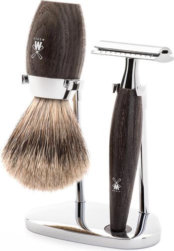 3-part shaving set without bowl, handles of bog oak with chromed metal accents: Shaving brush with fine badger Shaving brush size M = medium shaving brush head with 21 mm ring to screw off Safety razor, compatible with classic razor blades Stand made of metal, chrome-plated The Material - Bog oak This rare material is not a wood species in its own right, but comes from wood that sank into bogs many centuries ago and has undergone various processes of change in the meantime. This preserves the wood naturally and lastingly. An expressive, dark colour develops due to the tannins in the bog. The scarcity of these tree trunks today makes this material a genuine rarity. The colouring of the wood varies between brown, dark brown and black-brown. To begin with, square timbers are sawn from the few usable trunk sections and then turned out as handles. Several polishes with fine oils provide an additional seal for the surfaces and give them a silky-matt finish.Without chrome the world would forfeit a lot of its lustre. In the finish used for our wet shaving accessories it demonstrates its best qualities: The material is corrosion-resistant, very long-lasting and has a luxurious, alluring lustre. When contrasted with this, the colours and shapes of other premium materials are shown to their very best advantage.The Brushhead - Fine badger Fine badger is softer than pure badger, but somewhat firmer than silvertip badger. The hairs are light grey in colour and feature the dark stripe or band typical of high badger hair qualities. This natural hair material is extremely well-suited to wet shavers who value the softness of badger hair and want to achieve a massage effect. We process this quality mechanically according to the high standards which we apply to all MÜHLE products. If required, the crown of the brush head is slightly trimmed to obtain the perfect, typical shape of every single product. The Razorhead - Classic razor blade For generations, the safety razor has been regarded as a stylish classic which can even shave edges with precision. For many, it is the razor par excellence. Its styling is ideally suited to the design of the MÜHLE products. Even if the open blade does demand a little respect at first: After a brief familiarisation period, and guided by a steady hand, it produces a very close shave and a lasting result. Unlike modern blade systems, the head of the safety razor does not move. The blades are replaced by unscrewing the cap. They can be purchased from us and by retailers everywhere. We recommend our rust-proof MÜHLE razor blades which are the perfect match for our safety razors.