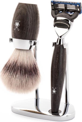 3-part shaving set without bowl, handles of bog oak with chromed metal accents: Shaving brush with Silvertip Fiber Shaving brush size M = medium shaving brush head with 21 mm ring to screw off 5-blade-razor, compatible with Gillette Fusion Stand made of metal, chrome-plated The Material - Bog oak This rare material is not a wood species in its own right, but comes from wood that sank into bogs many centuries ago and has undergone various processes of change in the meantime. This preserves the wood naturally and lastingly. An expressive, dark colour develops due to the tannins in the bog. The scarcity of these tree trunks today makes this material a genuine rarity. The colouring of the wood varies between brown, dark brown and black-brown. To begin with, square timbers are sawn from the few usable trunk sections and then turned out as handles. Several polishes with fine oils provide an additional seal for the surfaces and give them a silky-matt finish.Without chrome the world would forfeit a lot of its lustre. In the finish used for our wet shaving accessories it demonstrates its best qualities: The material is corrosion-resistant, very long-lasting and has a luxurious, alluring lustre. When contrasted with this, the colours and shapes of other premium materials are shown to their very best advantage.The Brushhead - Silvertip Fiber The high-quality synthetic Fibers represent a world first of our own invention. We offer a synthetically produced premium quality whose material characteristics are analogous to those of the precious natural hair, silvertip badger. The majority of the users even say that this quality actually provides better performance characteristics than the natural hair. 'Silvertip Fiber' is very soft at its fine tips, but somewhat more stable than natural hair in the middle section. These characteristics produce a pleasant, soft sensation on the skin when the lather is applied, without having to forgo the desired firmness of the hairs in the lathering process. In daily use, the manually processed Fibers are less sensitive than natural hair as they dry more quickly and are resistant to shaving soaps and creams. The completely vegan Fibers are also somewhat easier to use than natural hair as they produce a particularly creamy and thick lather from a small amount of shaving soap or cream, which is used much more sparingly as a result. The Razorhead - Gillette Fusion The latest shaving system from Gillette?_ embraces five blades positioned one above the other as well as a precision edging blade located on the back of the cartridge. This design ensures a very close and gentle shave. Its simple and safe handling is ideal even for newcomers. The blades are available from retailers everywhere.