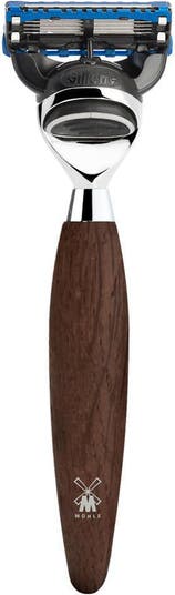 5-blade razor, compatible with Gillette Fusion Handles made of bog oak with chrome-plated metal highlights The Material - Bog oak This rare material is not a wood species in its own right, but comes from wood that sank into bogs many centuries ago and has undergone various processes of change in the meantime. This preserves the wood naturally and lastingly. An expressive, dark colour develops due to the tannins in the bog. The scarcity of these tree trunks today makes this material a genuine rarity. The colouring of the wood varies between brown, dark brown and black-brown. To begin with, square timbers are sawn from the few usable trunk sections and then turned out as handles. Several polishes with fine oils provide an additional seal for the surfaces and give them a silky-matt finish. Without chrome the world would forfeit a lot of its lustre. In the finish used for our wet shaving accessories it demonstrates its best qualities: The material is corrosion-resistant, very long-lasting and has a luxurious, alluring lustre. When contrasted with this, the colours and shapes of other premium materials are shown to their very best advantage. The Razorhead - Gillette Fusion The latest shaving system from Gillette?_ embraces five blades positioned one above the other as well as a precision edging blade located on the back of the cartridge. This design ensures a very close and gentle shave. Its simple and safe handling is ideal even for newcomers. The blades are available from retailers everywhere.