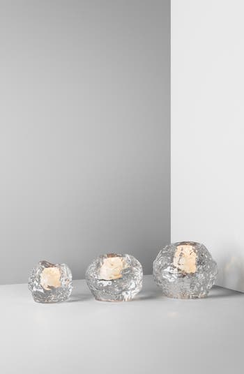 Inspired by spirited snowball fights and sparkling views through frosted windows, this trio of glass votives diffuses light to bring warmth to any décor. Use your own white candles for a snowy look, or choose a color that coordinates with a festive tabletop display.