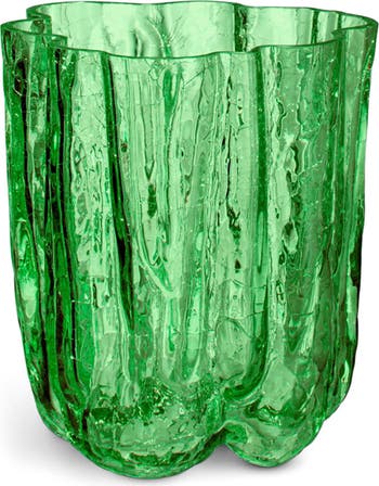 Mouth-blown in Sweden and dipped in ice-cold water, this crackly glass vase embraces imperfection and offers a whimsical accent to any room, with or without folliage.