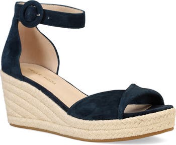 Rows of braided jute covering a soaring wedge heel lend warm-weather charm to a supple suede sandal featuring a delightfully twisted toe strap.