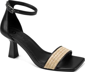 - Adjustable ankle strap with buckle closure; hidden elastic inset