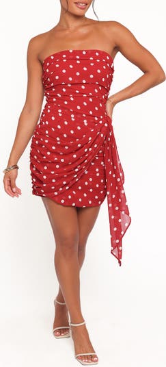 Playful polka dots dance across this strapless minidress cut from airy georgette. Ruching through the body creates a sleek, sculpted fit, while a swag detail at the front adds soft drape. A scarf panel trails from the hip beyond the hem for dramatic movement and a touch of vintage-inspired flair.