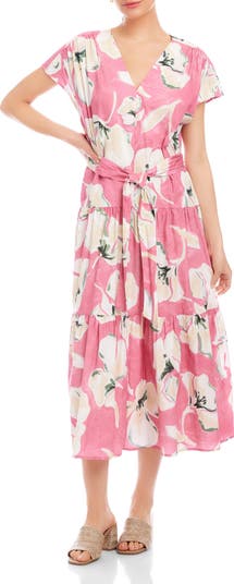 Painted in a soft watercolor floral, this cotton tiered midi dress is fashioned with gathering across the yokes and down the dolman sleeves, with the volume controlled at the waist by a tied sash.