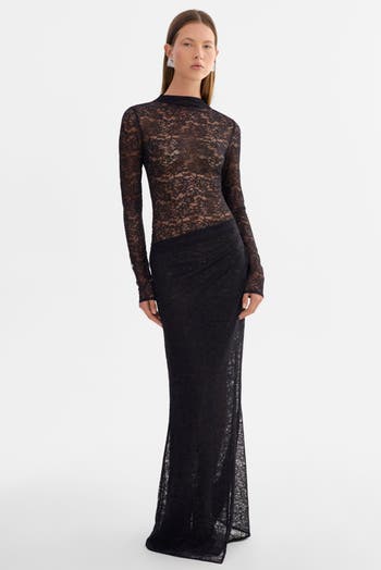 The Krysta Lace Maxi Dress embodies dramatic elegance in sheer stretch lace. With its fitted long-sleeve silhouette, slight mock neck, and fluid mermaid hem, it creates a striking evening profile. Asymmetric pleated overlay detailing enhances the shape, adding depth and movement. Perfect for festive gatherings, it offers a modern interpretation of holiday glamour.