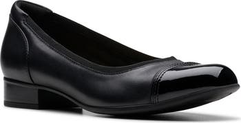 A glossy cap toe polishes the look of this leather pump set on a low block heel and moulded with a cushioned footbed for soft support.