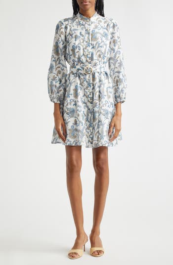 A floral paisley shirtdress drapes beautifully in a luxe linen-and-silk blend, bringing airy elegance to a timeless silhouette. Long sleeves, a refined band collar and an adjustable belt create a flattering and polished fit.