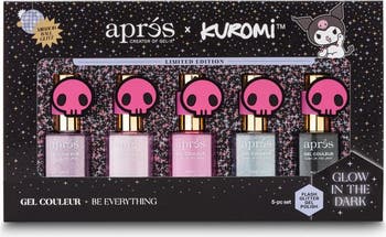 In this set of limited edition five playful glow-in-the-dark colors, Kuromi™ Flash Glitter Gel couleur will capture all the shades of troublemaking and mischievous partying with friends. Each magical bottle of Kuromi™ Flash Glitter Gel couleur comes with Aprés Nail’s innovative Brush-X™, making application fun and easy! The Kuromi™ Flash Glitter Gel couleur is HEMA-free, vegan and cruelty-free and safe for natural nails with a base gelcoat and great with Gel-X® Tips. WHAT’S INCLUDED 10ml Wild 10ml Besties 10ml Party 10ml Together 10ml All Night 5x Pink Skull cap accessories DIRECTIONS Apply a layer of ultra reflective Kuromi™ Flash Glitter Gel couleur and cure in an LED light for 30s. Finish with Aprés Non-Wipe Top Gelcoat and you’re ready to party ‘til dawn! Pro Tip – shine your flash on the colors to see just how reflective these Gel Couleurs are! CAUTION Keep out of reach of children! This is not a toy. For Professional use only. Discontinue use if sensitivity or irritation occurs. Please clean bottles with alcohol only.