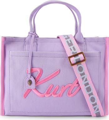 An embroidered logo boldly accents this canvas tote bag fashioned with multiple carrying straps for versatile wear.