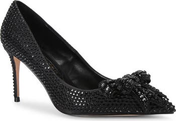 Shimmering rhinestones stand out against a mesmerizing satin pump framed by a glittering bow accent, pointy toe and stiletto heel.