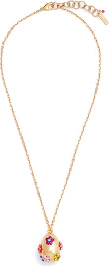 Colorful crystal-centered flowers ornament the gleaming egg-shaped pendant of this necklace that makes a playful statement.