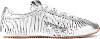 This lace-up sneaker gets a glam upgrade with gleaming metallic leather, fringe trim and crystal-studded laces.