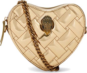 A signature crystal-encrusted eagle head embellishes the geo-quilted exterior of a heart-shaped leather bag fashioned with a chain crossbody strap.