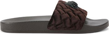 Signature eagle's-head hardware brings luxurious shine to this soft velvet slide sandal textured by plush quilting or accented by swirling crystals.