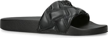 A signature crystal-encrusted eagle head details the quilted strap of a summer-ready slide sandal grounded by a contoured footbed.
