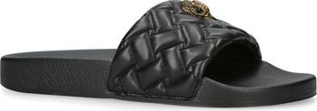A signature crystal-encrusted eagle head details the quilted strap of a summer-ready slide sandal grounded by a contoured footbed.