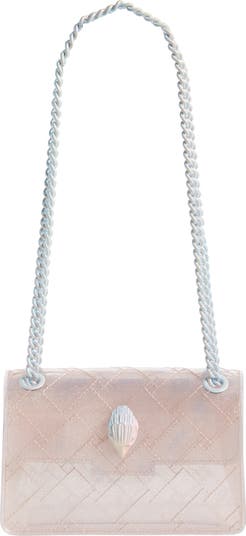 A signature crystal-encrusted eagle head and translucent material elevate a glittery crossbody bag that adds sparkle to any outfit.