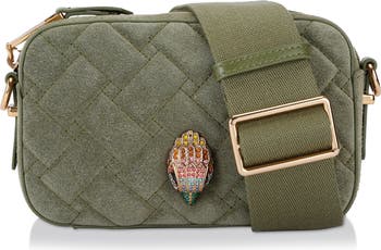 A signature crystal-encrusted eagle head embellishes a geo-quilted leather camera bag fashioned with a detachable webbing strap for sporty appeal.