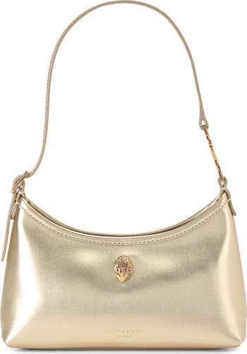 Lustrous metallic leather construction enhances the appeal of a slender shoulder bag marked by the brand's logo and signature eagle-head hardware.