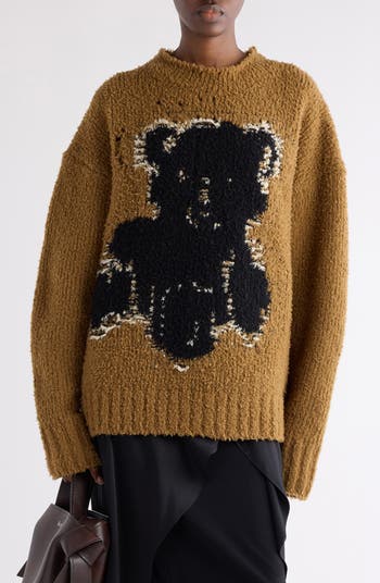 Playful yet commanding, this wool-blend sweater puts texture front and center with an intarsia-knit bear boldly taking over the front. A mock neck adds polish to the oversized silhouette, making it equal parts whimsical and refined.