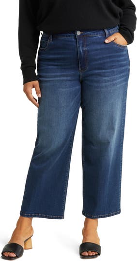 A wide leg furthers the trendy style of dark-wash jeans featuring Fab Ab front pockets that comfortably flatten and shape.