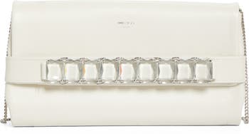 Chunky baguette-cut crystals lining the hand strap bring a glamorous flourish to this lambskin-leather clutch furnished with a gleaming chain strap for hands-free carry.