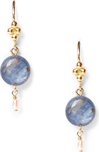 Kyanite beads and cultured pearls give natural beauty to refined drop earrings crafted from sterling silver and plated in 18-karat gold.